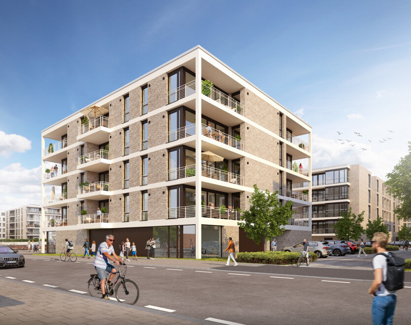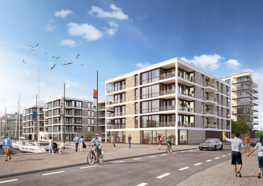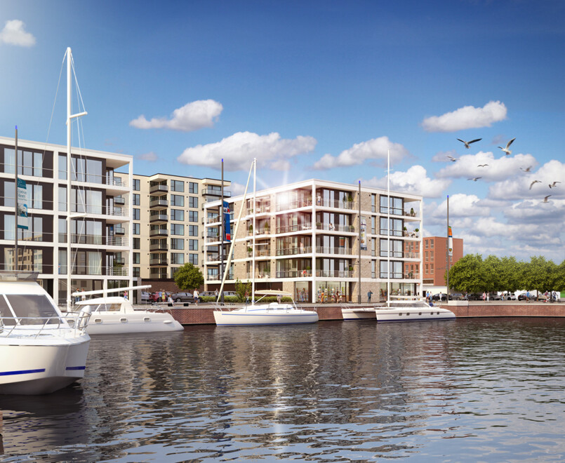 Das direkt am Hafenbecken gelegene PANORAMA 2 zeichnet sich durch seine offene Architektur und sein modernes, zeitloses Außendesign aus. Bis Herbst 2024 entstehen hier auf insgesamt fünf Etagen 24 stilvolle 2- und 3-Zimmer-Eigentumswohnungen mit Größen von circa 61 bis 90 Quadratmetern sowie eine Gewerbeeinheit mit rund 106 Quadratmetern. Die helle Fassade des Gebäudes ist dabei durch eine Vielzahl großer Fenster gegliedert und wird durch den eleganten, lichtdurchfluteten Ladengeschäftsbereich im Erdgeschoss optisch abgerundet. Ein geräumiges und attraktives Treppenhaus mit großen Fenstern und einem barrierearmen Zugang zum Aufzug über alle Etagen ermöglicht auch vollbepackt mit Einkäufen ein entspanntes Nachhausekommen.