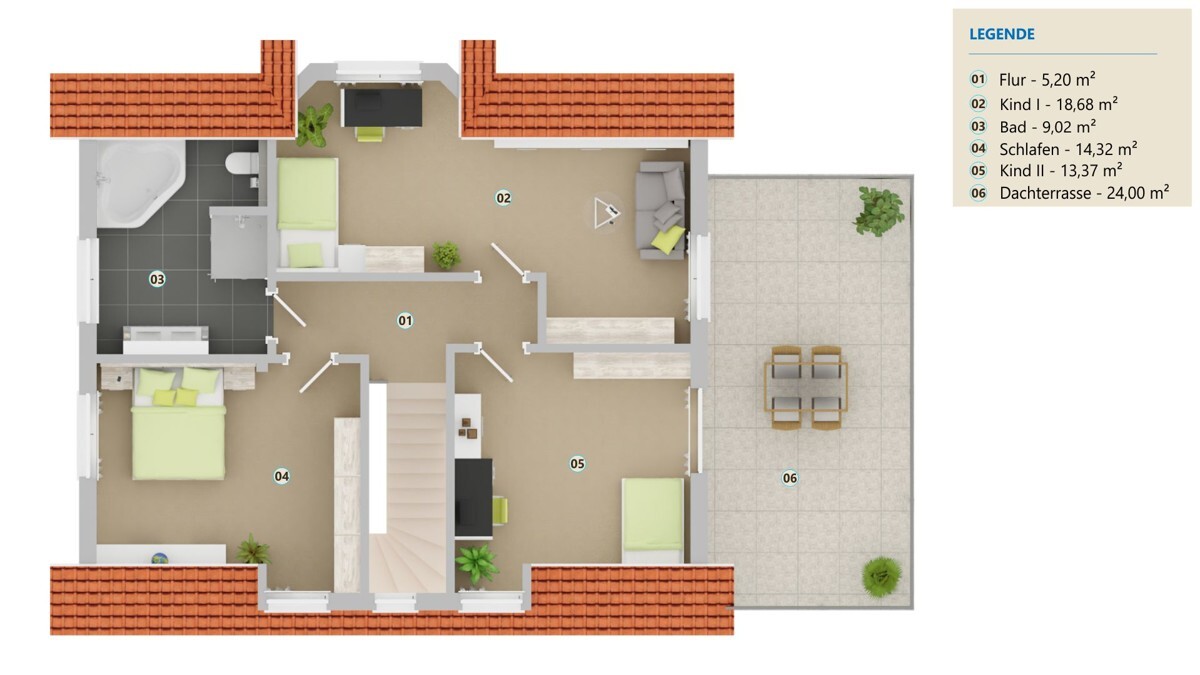Das Obergeschoss wurde in klassischer Raumaufteilung mit drei Schlaf- bzw. Kinderzimmern und dem großen Hauptbad mit Badewanne und Dusche geplant. Ein Highlight ist sicherlich die Dachterrasse mit Blick ins Grüne. Der Spitzboden beherbergt die moderne Gasbrennwerttherme und bietet zugleich einigen Stauraum.