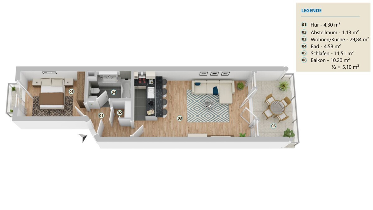 Ein Highlight der Wohnung ist der großzügige Balkon mit Blick ins Grüne – ein Ort zum Entspannen, Genießen und Durchatmen mitten in der Stadt.