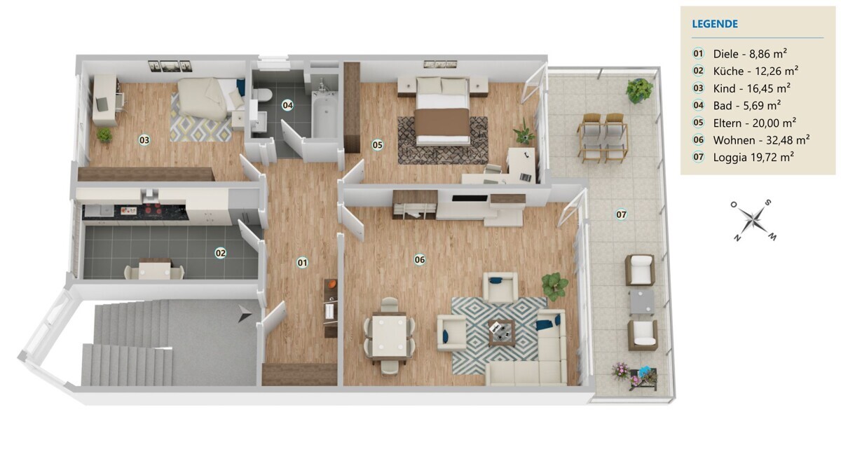 Helle Räume, hochwertiger Boden im Wohnbereich und eine fast 20 m² große sonnige Süd-West-Loggia machen diese vermietete Eigentumswohnung zu einem attraktiven Zuhause – oder zur sicheren Kapitalanlage.